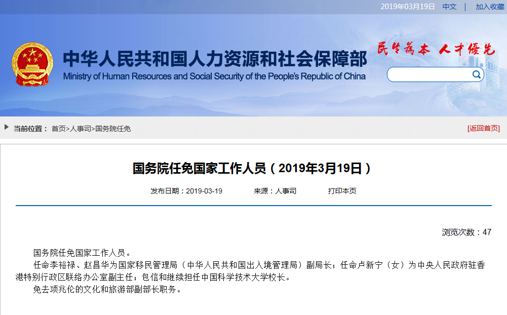 人社部网站3月19日消息,国务院任免国家工作人员。