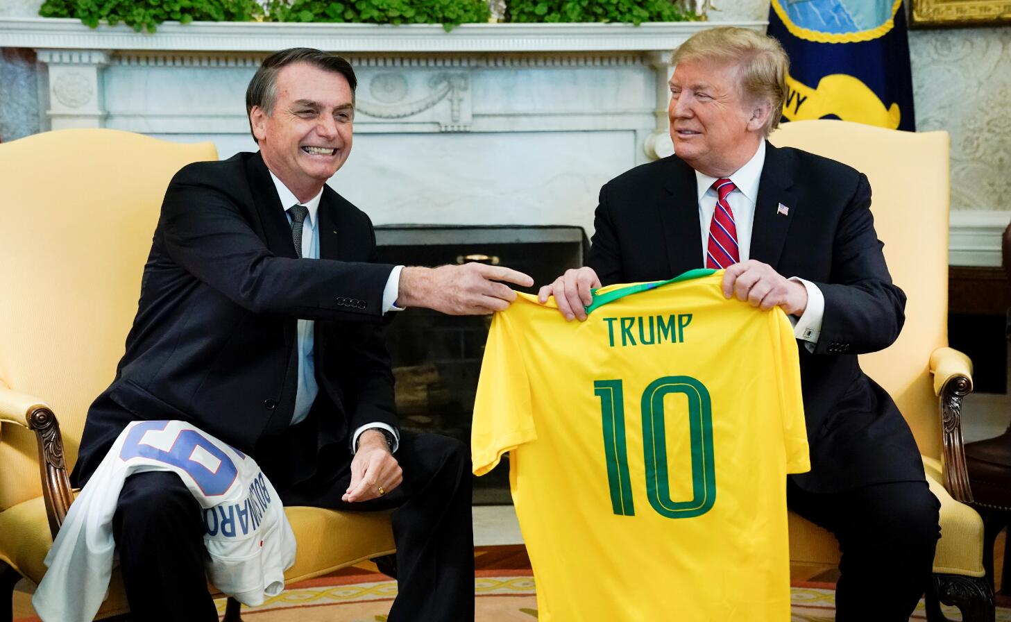 美國總統特朗普(右)與巴西總統博索納羅(左)19日在白宮會面。會談後兩人交換國家隊球衣,特朗普稱自己還記得巴西傳奇球星比利,而博索納羅贈予他的正是代表比利的10號球衣。路透社