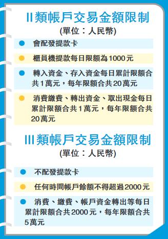而III類帳戶則不會配發提款卡,任何時間帳戶餘額不得超過2000元;消費、繳費、帳戶資金轉出等每日累計限額合共2000元,每年限額合共5萬元。(見表)