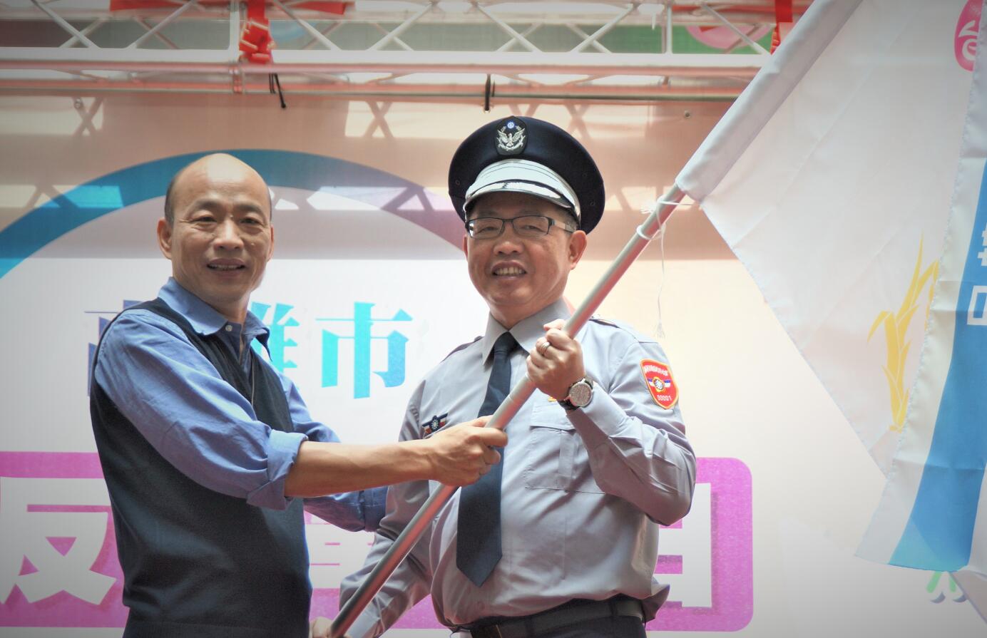 高雄市政府20日舉辦「反登革熱日」誓師宣導大會,韓國瑜(左)授旗給義警志工。中央社