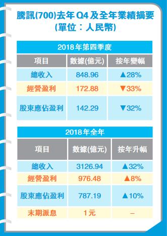 【香港商報网訊】記者潘晶報道:騰訊(700)昨日公布業績,單計去年第四季度,雖然收入按年增加28%至約848.96億元(人民幣,下同),惟股東應佔盈利按年大跌32%,至142.29億元,創下騰訊有紀錄以來最大的單季跌幅。期內,經營盈利按年跌33%至172.88億元,經營利潤率亦由去年同期的39%下跌至20%。