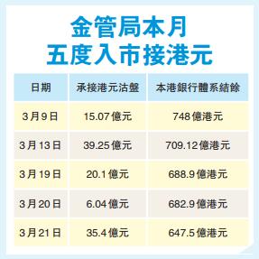 港匯昨天低見7.85,觸發弱方兌換保證,金管局再在市場承接港元沽盤,買入35.4億港元,銀行體系總結餘將降至約647.5億港元。金管局已連續第3個交易日承接港元沽盤,3月以來金管局共已買入逾115億港元。
