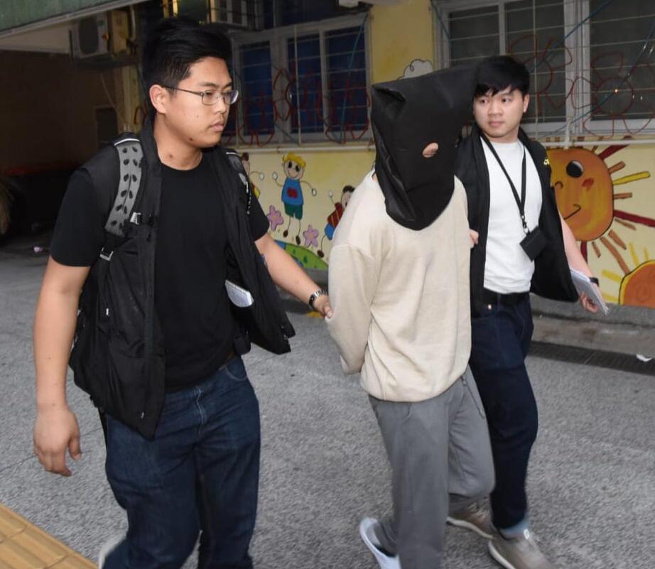 警方人員押解其中一名疑犯到柴灣環翠邨蒐證。