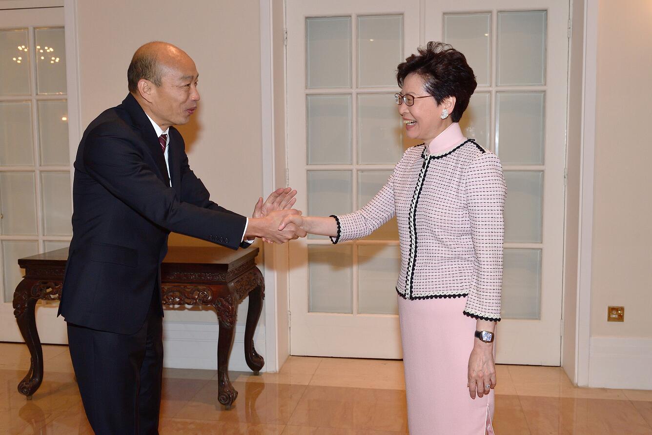 林鄭月娥歡迎韓國瑜上任後首次訪港,出席下午舉行的農產品推介會及進行其他參觀活動。