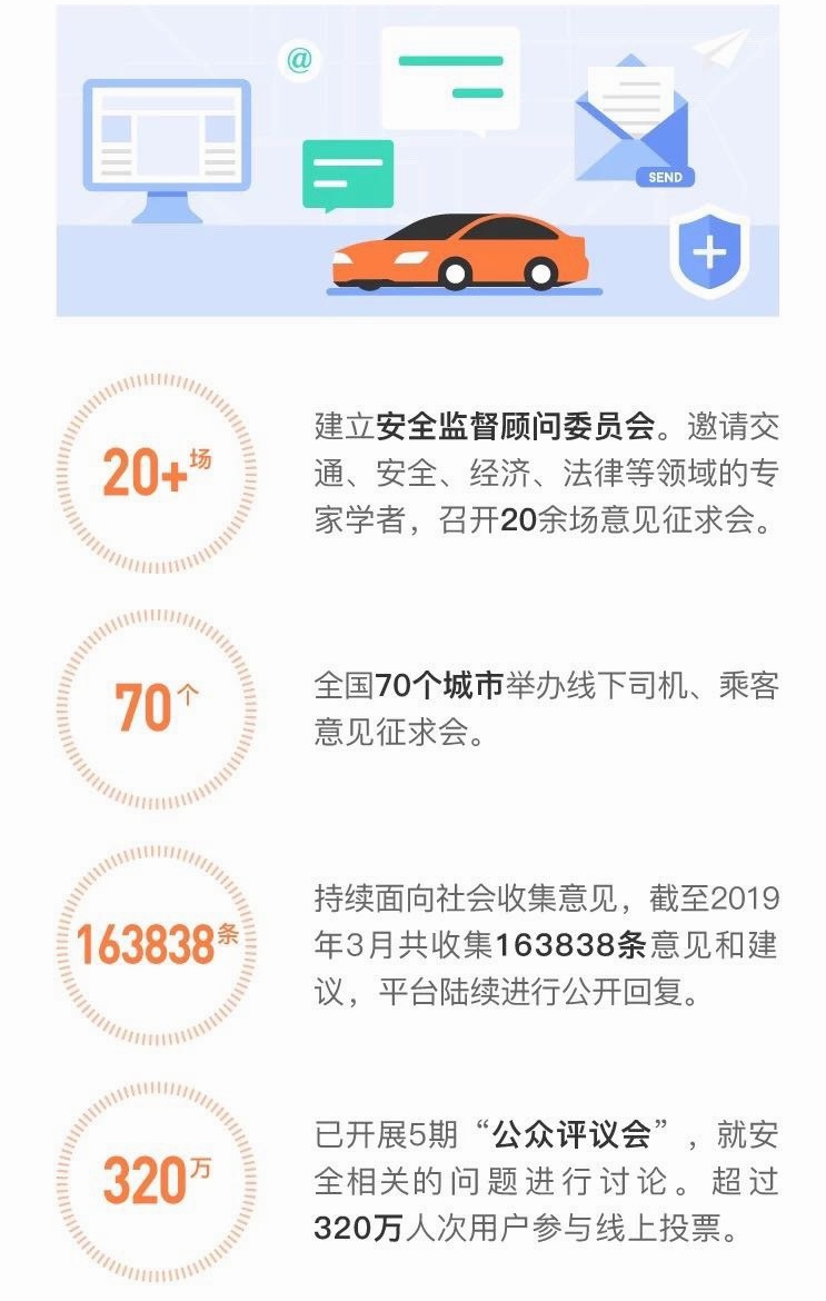 目前滴滴已在全国70个城市举办线下司机、乘客意见征求会,持续向社会征集意见,截止2019年3月,共收到163838条意见和建议,并陆续进行公开回复。
