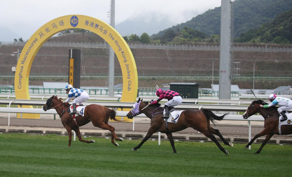 從化馬場首場速度馬術比賽由高伯新馬房的「雪戰神駒」勇奪冠軍的衝線鏡頭。 記者 陳志誠攝