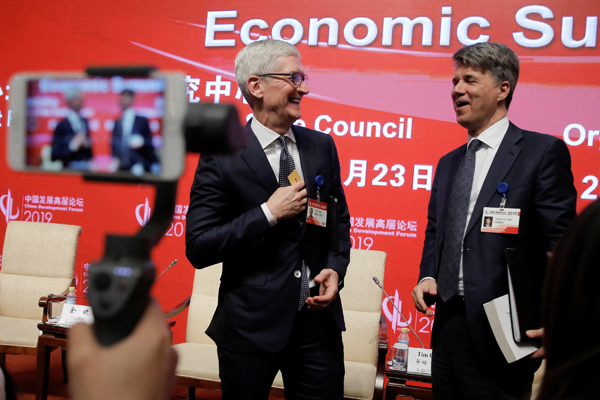 蘋果CEO庫克(左)和寶馬集團董事長科魯格(右)昨日在北京出席中國發展高層論壇。 路透社