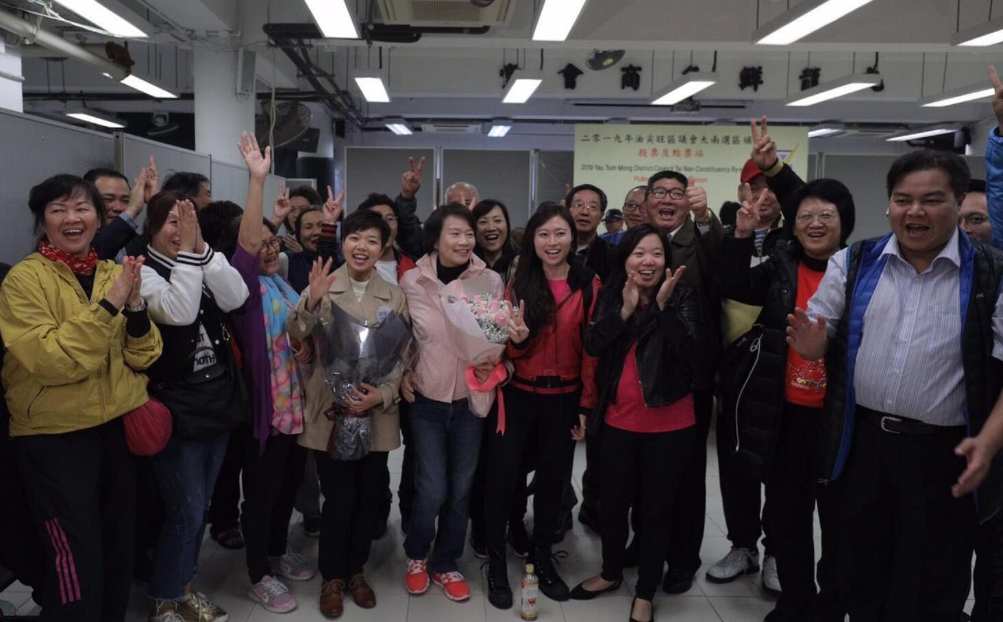 李思敏(前排左四)當選後,在經民聯副主席梁美芬陪同下,在點票站與支持者歡呼合影。