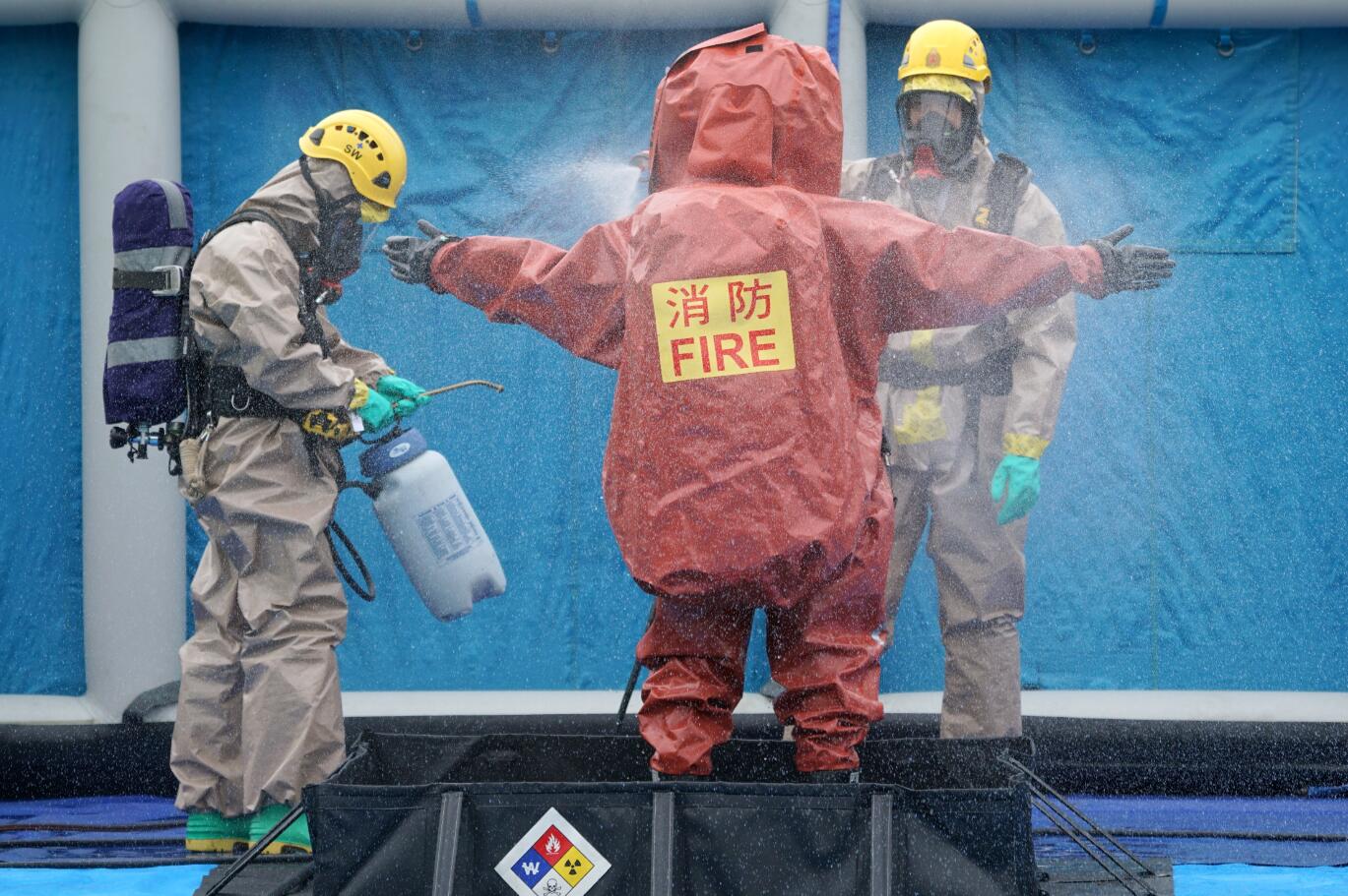 演習模擬恐怖分子投放有害化學氣體後,身穿防化服的警察在現場搜捕。