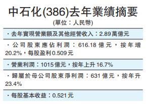 【香港商報網訊】記者姚一鶴報道:中石化(386)昨公布2018年業績,去年營收2.89萬億元(人民幣,下同),按年增22.5%,歸屬於母公司股東的淨利潤630.89億元,按年升23.4%。公司預估2019年資本支出人民幣1363億元,年增15.5%。