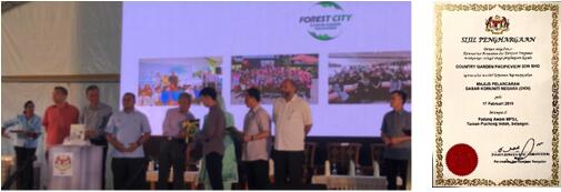 (2019年2月17日森林城市在马来西亚国家社区政策(DKN)的正式启动仪式上荣获马来西亚首相马哈蒂尔亲自颁发表彰和证书)