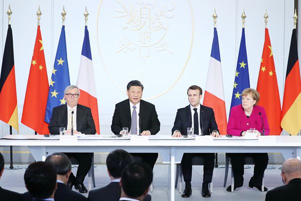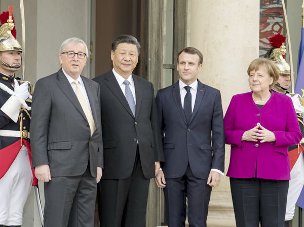 3月26日,国家主席习近平在巴黎同出席中法全球治理论坛闭幕式的法国总统马克龙、德国总理默克尔和欧盟委员会主席容克举行会晤。新华社