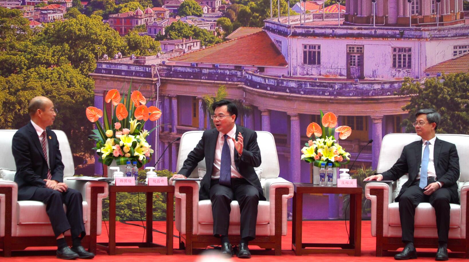 廈門市委書記胡昌升(中)、市長莊稼漢(右)會見韓國瑜。