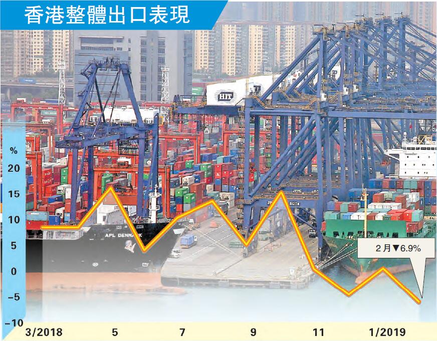 2月份本港整體出口和進口貨值均錄得按年跌幅,分別跌6.9%和3.8%,其中出口為連續4個月下跌,跌幅大於預期。