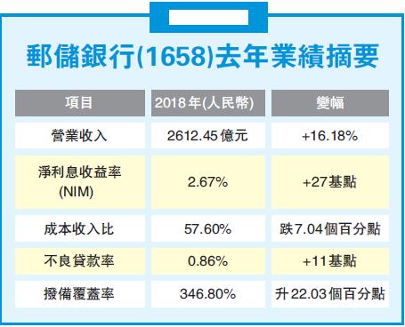 【香港商報网訊】記者鄧建樂報道:郵儲銀行(1658)昨晚率先公布2018年度業績,據年報顯示,郵儲銀行淨利潤首次突破500億元,達到523.84億元(人民幣,下同),同比增長9.80%,撥備前利潤同比增長高達39.91%。