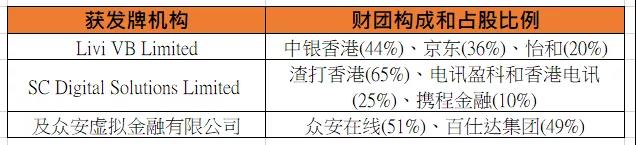 其中,Livi VB是由中银香港(2388)、京东、怡和合组的,三家公司的占股分别为44%、36%和20%。而SC Digital Solutions Limited则由渣打香港(2888)、电讯盈科(0008)和香港电讯(6823)及携程金融合组,三家公司持股分别我65%,25%和10%。众安虚拟金融则由众安在线(6060)、和百仕达集团(1168)合组,两者分别占股51%和49%。