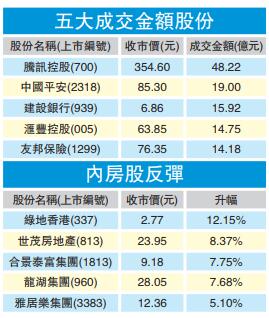 藍籌股個別發展,騰訊(700)、友邦保險(1299)均升接近1%,但中移動(941)則逆市下跌。醫藥股回穩,石藥(1093)升近2%。國際油價回升,日前遭大行唱好的中海油(883),股價升近4%。至於中石油(857)只升不足1%。石油服務股亦有資金流入,中石化油服(1033)升超過3%。
