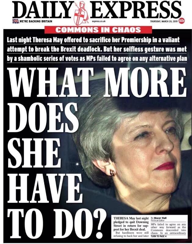 如果梅的脱欧协议依然被否,我相信她还是会迅速辞职,让位给新领导人,既然打出所有底牌后,协议还是没过,那就意味着这个协议的正式死亡,谈出这个协议的首相也没有必要继续待着。