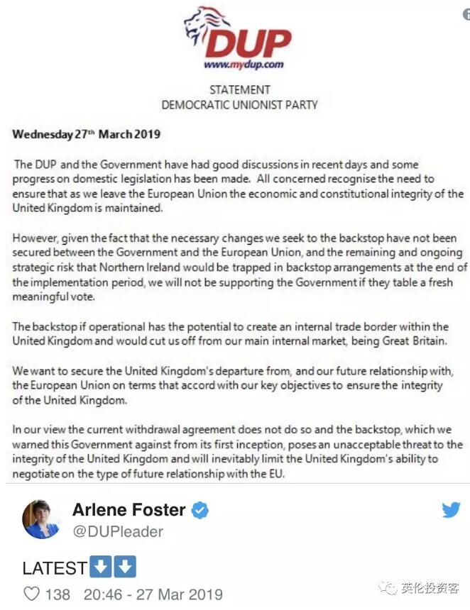 关于脱欧协议的第三次议会投票很可能在明后天进行,DUP的反对票也让协议能否通过悬念丛生。