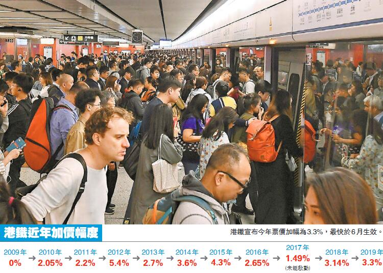 政府統計處昨日公布去年第4季運輸業名義工資指數變動為5.9%。按照港鐵票價調整方程式計算,連同早前公布的去年12月通脹指數為2.5%,減去額外的0.6%扣減,得出的結果是3.6%。由於票價調整設有「封頂」機制,規定其票價加幅不能高於前一年第4季家庭住戶入息中位數變動幅度,而根據統計處公布的2018年第4季《綜合住戶統計調查按季統計報告》顯示,去年第4季家庭月入中位數為28200元,較2017年的27300元按年增加3.3%,故港鐵今年票價實質加幅為3.3%,高於2018年的3.14%。