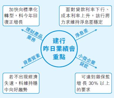資產質素方面,建行副行長廖林指出,去年該行的不良貸款率及撥備覆蓋率等多個財務指標均有改善,「該升的升,該跌的跌」,反映資產質素良好,在不出現重大經濟失速的情況下,料資產質素可維持穩中向好的趨勢。