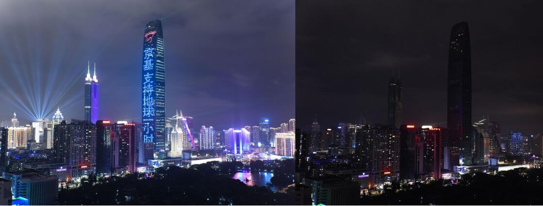 京基100大廈熄燈前後。熄燈前,大廈亮起「京基支持地球一小時」字幕
