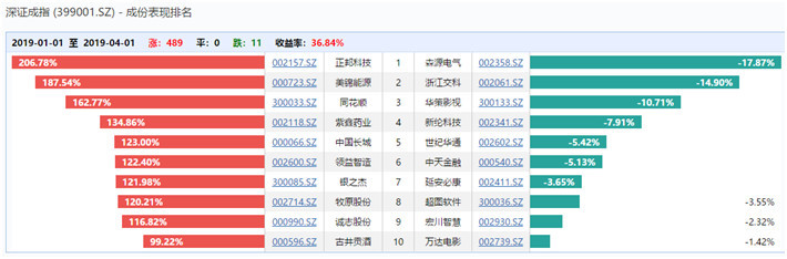 个股方面,一季度深成指成分股中共有489股上涨,仅有11股下跌,9股一季度股价翻倍,正邦科技、美锦能源、同花顺、紫鑫药业涨幅最高。森源电气、浙江交科和华策影视一季度跌幅超过10%。