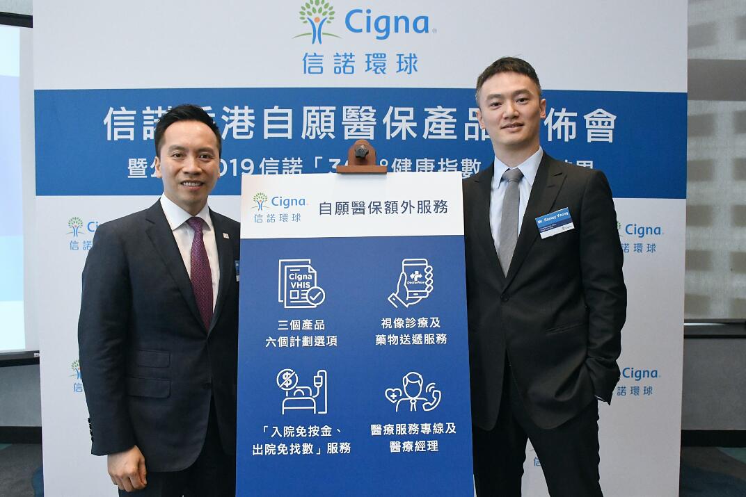 信諾香港行政總裁及區域總經理陳宇文(左)、以及信諾香港首席市場總監楊偉君一同發表最新自願醫保產品。 記者 馮瀚文攝