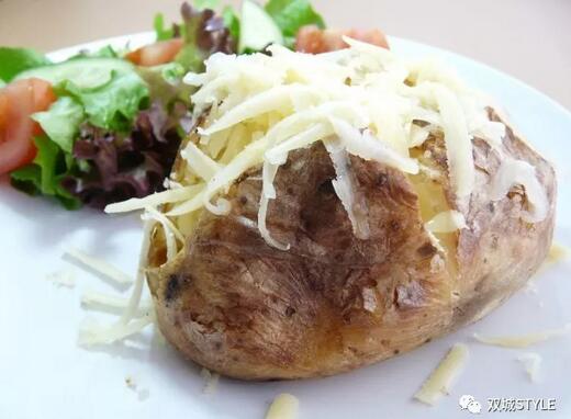 做法:馬鈴薯洗淨,用叉在表面均勻刺小孔約二十多下,後在表面塗上橄欖油。再用已濕水的廚房紙覆蓋馬鈴薯,放入焗爐第一面叮7分鐘,取出反面叮7分鐘,稍涼後切十字,不要切到底。西蘭花洗淨,切成小塊,先烚熟,取出瀝乾放入馬鈴薯內,並隨意加入芝士碎。預熱焗爐或多士爐至180℃,焗5分鐘至芝士溶化或金黃色,取出即可食用。