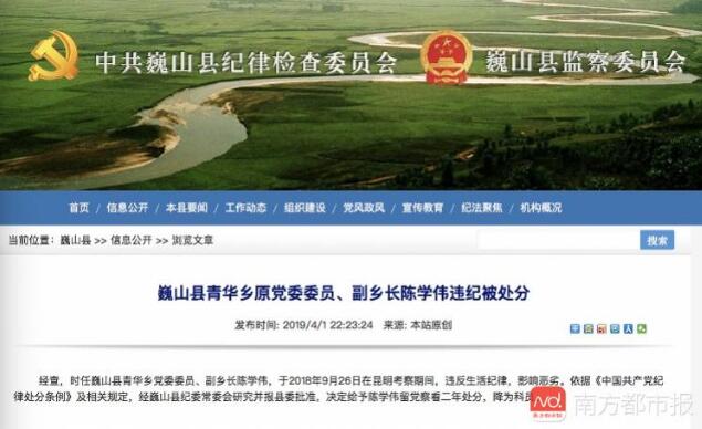 4月1日深夜,巍山县纪委监察委官网通报此事调查结果:“经查,时任巍山县青华乡党委委员、副乡长陈某伟,于2018年9月26日在昆明考察期间,违反生活纪律,影响恶劣。”通报表示,依据《中国共产党纪律处分条例》及相关规定,经巍山县纪委常委会研究并报县委批准,巍山县纪委监察委决定给予陈学伟留党察看二年处分,降为科员。