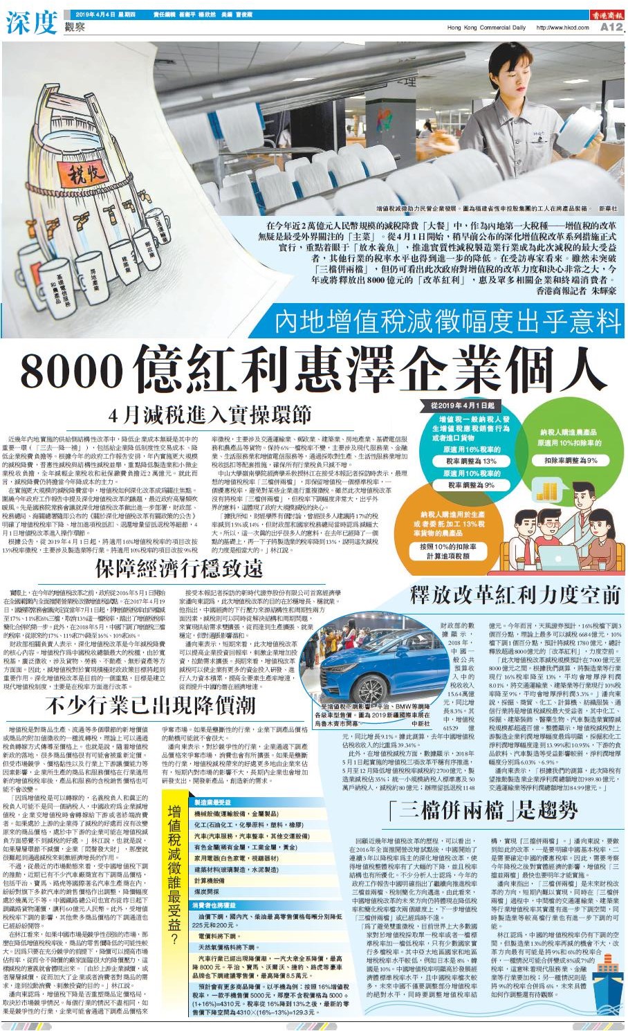【香港商报网讯】在今年近2萬億元人民幣規模的減稅降費「大餐」中,作為內地第一大稅種——增值稅的改革無疑是最受外界關注的「主菜」。從4月1日開始,稍早前公布的深化增值稅改革系列措施正式實行,重點着眼于「放水養魚」,推進實質性減稅製造業行業成為此次減稅的最大受益者,其他行業的稅率水平也得到進一步的降低。在受訪專家看來。雖然未突破「三檔併兩檔」,但仍可看出此次政府對增值稅的改革力度和決心非常之大,今年或將釋放出8000億元的「改革紅利」,惠及眾多相關企業和終端消費者。香港商報記者 朱輝豪