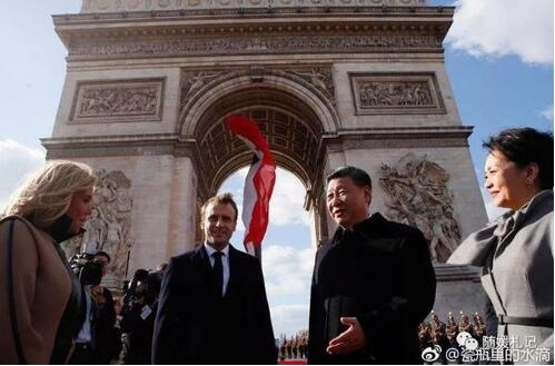 凯旋门下举行欢迎仪式很罕见。许多民众为了一睹盛况,寒风凛冽仍坚持全程观礼。