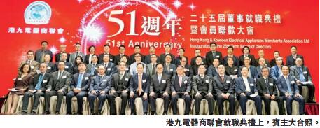 【香港商報网訊】記者張芃芃報道:港九電器商聯會日前假龍堡國際酒店舉行第二十五屆董事就職典禮暨會員聯歡大會,李子良、蒙德揚分別續任會長及主席。中聯辦副主任陳冬、商務及經濟發展局署理局長陳百里、中聯辦協調部部長朱文、原協調部部長沈沖、機電工程署署長薛永恒、立法會議員邵家輝蒞臨主禮,與一眾會員共敘商情。