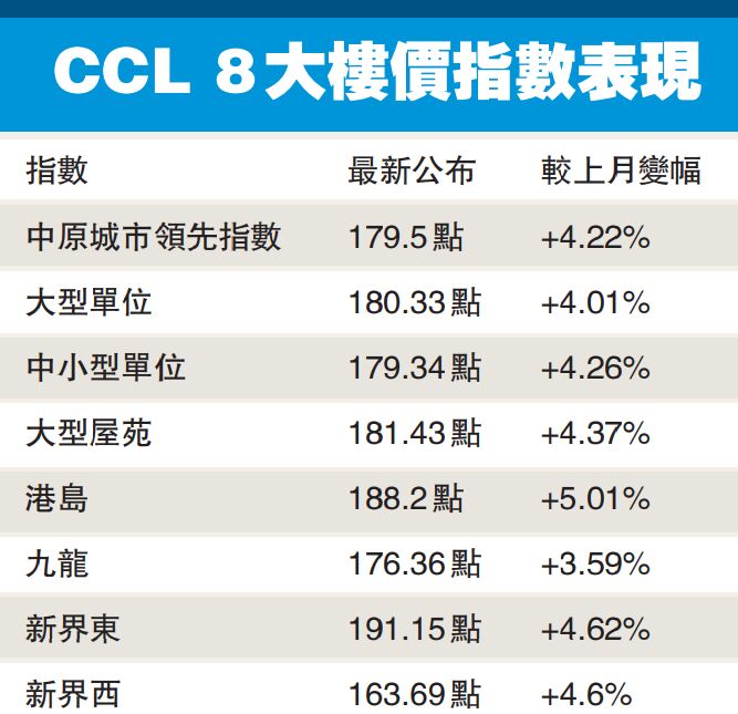 根據昨日發布的最新數字,中原城市大型屋苑領先指數CCL Mass報181.43點,按周升1.02%,近3星期累積升3.45%。至於CCL中小型單位、CCL大型單位按星期亦分別升1.05%及1.85%,其中CCL大型單位升幅是逾1年來最大單一星期升幅,亦是連升6個星期,累升逾5%。