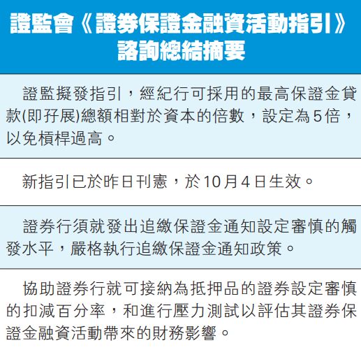 記者吳天淇報道:證監會就收緊券商孖展借貸的《證券保證金融資活動指引》諮詢作總結,將券商借出的孖展總額上限定於資本的5倍。該指引已於昨日刊憲,並將於2019年10月4日生效。