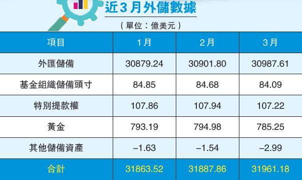 【香港商報网訊】外匯局昨日公布數據顯示,截至2019年3月末,中國外匯儲備規模為30987.61億美元,相比2月增加近86億美元,升幅約0.3%,高於經濟學家的預測中值30900億美元。至此,中國外匯儲備已實現月度環比「五連增」。外匯局發言人王春英表示,3月外儲小幅上升主要受中美經貿談判、歐美央行貨幣政策預期調整、英國退歐不確定性等多重因素影響。此外,中國連續四個月增持黃金,3月末黃金儲備為6062萬盎司,環比增加36萬盎司。