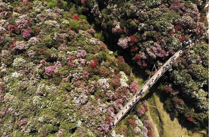 4月7日,游客在贵州省毕节市百里杜鹃金坡景区游览(无人机拍摄)。新华社