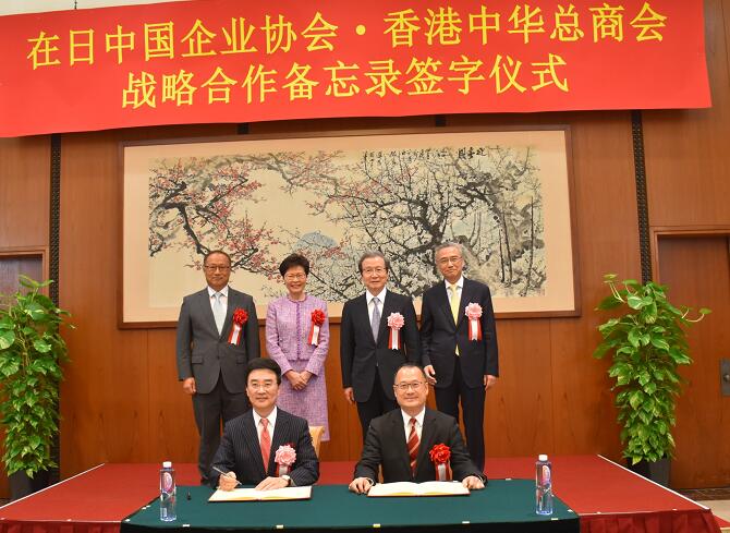 據悉,該簽字儀式在中國駐日本大使館舉行,香港特區行政長官林鄭月娥、中國駐日本大使程永華、宋耀明公使等出席,並對兩大商會攜手表示熱烈祝賀。隨後,蔡冠深會長及王家馴會長簽署了戰略合作備忘錄。