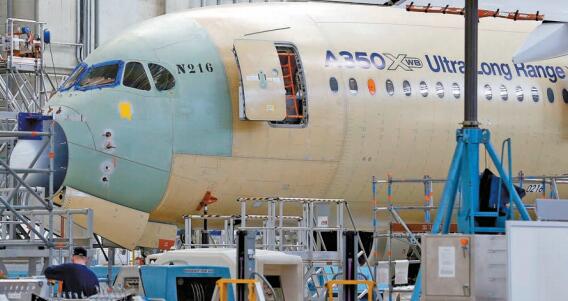 在空巴法國圖茲廠房,一架A350正進行組裝。 路透社