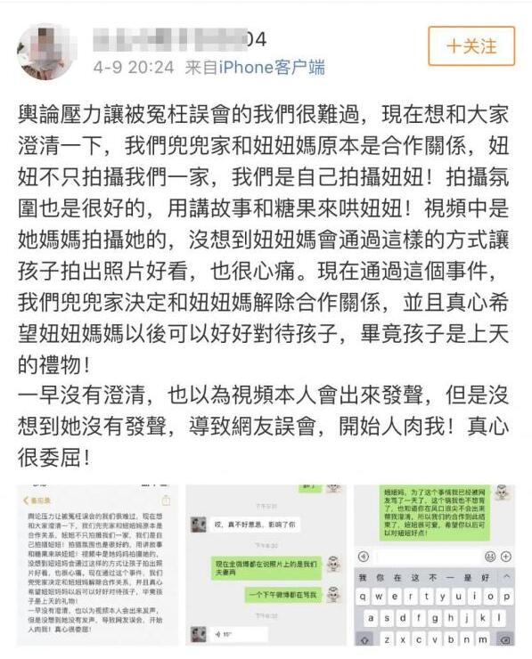 4月10日凌晨4点,一个名为“妞妞妈 -201009”的微博用户发布道歉声明称,自己是妞妞的妈妈,视频中并非在虐童,而是“在沟通教导”。