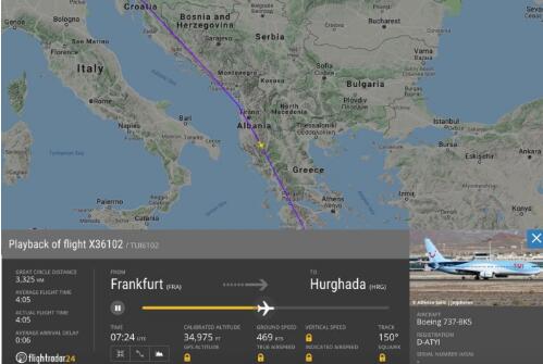曾一度与地面失去联络的德国波音737客机飞行轨迹。(图源:Flightradar24)