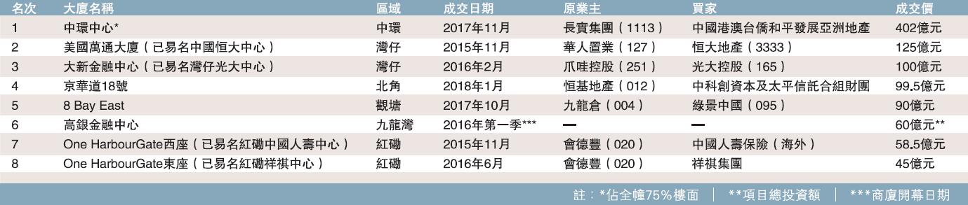 除長和系出售地標性物業,中資企業也從華人置業(127)、爪哇控股(251)、恒基地產(012)、會德豐(020)手上收購地標性物業。其中,位於灣仔告士打道、原本稱為大新金融中心和美國萬通大廈的物業,分別被光大控股(165)和恒大集團(3333)收購;另外,美國萬通大廈於2015年被恒大集團以125億元收購時,一度長時間位處中資企業購入香港商廈成交榜榜首,創紀錄的成交金額被長和系出售中環中心時打破。