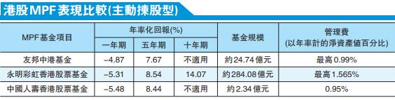 下面我們先把焦點放在香港股票基金成分,記者查閱積金局官網資料發現,本港44隻香港股票基金MPF中,過去一年回報最好的頭16隻皆為追蹤指數MPF,而主動選股的港股MPF中,年率化回報表現最好的三隻分別為「友邦強積金優選計劃中港基金」(-4.87)、「永明彩虹強積金香港股票基金」(-5.31)、「中國人壽強積金集成信託香港股票基金」(-5.48)。而排尾三的則是「宏利MPF香港股票基金」(-7.61)、「安聯香港基金」(-7.77)以及「美國萬通香港股票基金」(-7.79)。