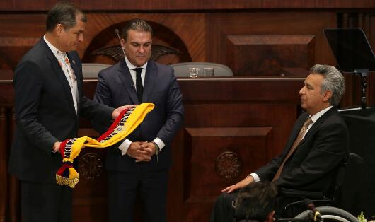 2017年5月24日,拉斐尔·科雷亚(左)和莱宁·莫雷诺(右)交接厄瓜多尔总统(资料图)