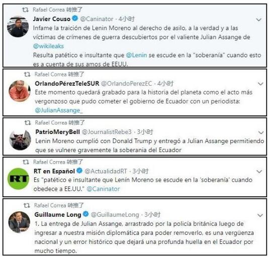 科雷接连转发数条抨击现总统莫雷诺决定的推文,推文中有人表示,这一时刻(抓捕阿桑奇)是”厄瓜多尔政府所犯下的,最可耻的行为”,还有人说英国警方进入厄瓜多尔使馆抓人,是“国家的耻辱,历史的错误。”