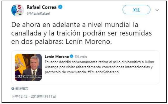 当初决定庇护阿桑奇的厄瓜多尔前总统强烈抨击其决定,据“今日俄罗斯”(RT)4月11日报道,前总统科雷亚称现总统莫雷诺是“厄瓜多尔历史上最大的叛徒”。