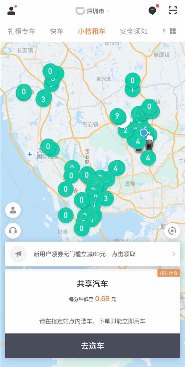 此次,小桔租车登陆深圳,将在龙华、南山、宝安三个主要区域开通60个车辆取还网点,共计200辆共享汽车供用户使用。