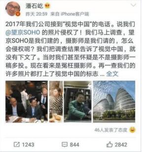 而面臨越來越多的用戶起訴,視覺中國的麻煩才剛剛開始。據微博消息,4月12日晚間, SOHO中國董事長潘石屹發微博稱,2017年曾接到「視覺中國」電話,說自己請的攝影師拍攝自家望京SOHO的照片侵權了!