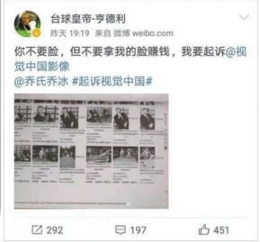 無獨有偶,據每日經濟新聞報道,4月12日晚間,英國台球界傳奇人物,有?「台球皇帝」之稱的亨德利在微博發文怒懟視覺中國:「你不要臉,但不要拿我的臉賺錢。」亨德利還@了視覺中國,並表示要起訴對方。此外,近日包括知名藝人及商界人士在內的公眾人物表示將起訴視覺中國。