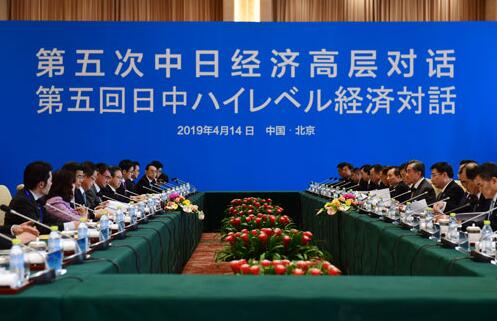 2019年4月14日,国务委员兼外交部长王毅在北京与日本外相河野太郎共同主持第五次中日经济高层对话。